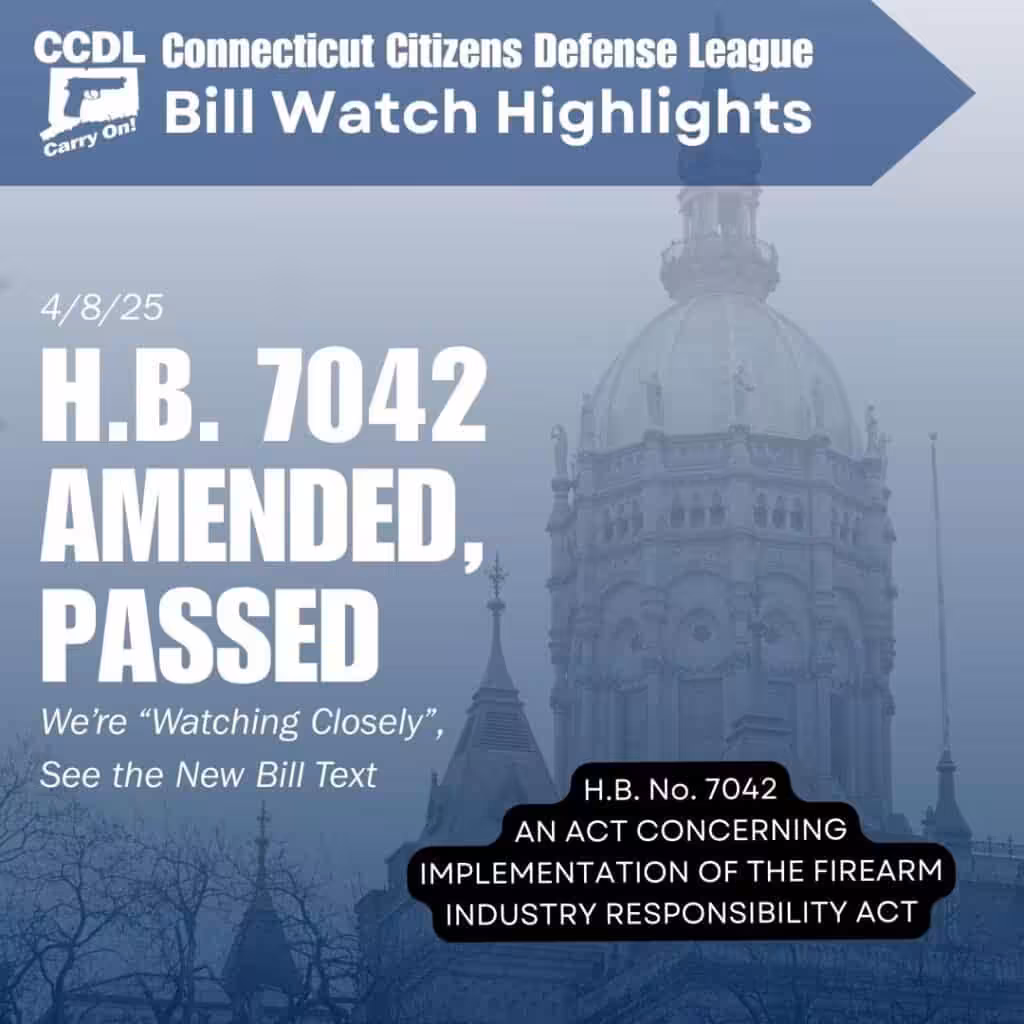 Yesterday the Judiciary Committee passed H.B. 7042 with amendments. What was passed is stridently different from the original text, and CCDL has now taken a neutral position on the bill. We will watch it closely as it approaches the floor for a vote.